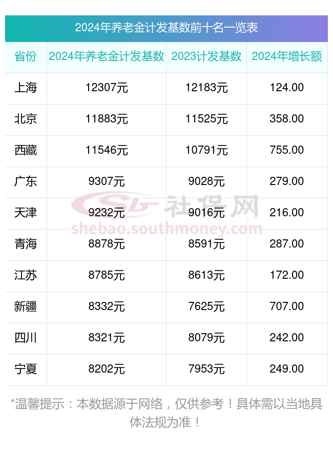 据新社通app显示,2024年上海位列第一位,养老金计发基数达到12307.00元,增长率为1.02%;北京排名第二,养老金计发基数为12183.00元,增长率为6.91%;西藏排名第三,养老金计发基数11883.00元,增长率为3.11%。排名前10的还有:广东(11546.00元,7.00%)、天津(11525.00元,4.00%)、青海(11010.00元,1.99%)、江苏(9307.00元,3.09%)、湖北(9232.00元,2.40%)、新疆(9016.00元,3.97%)、四川(8878.00元,3.34%)。