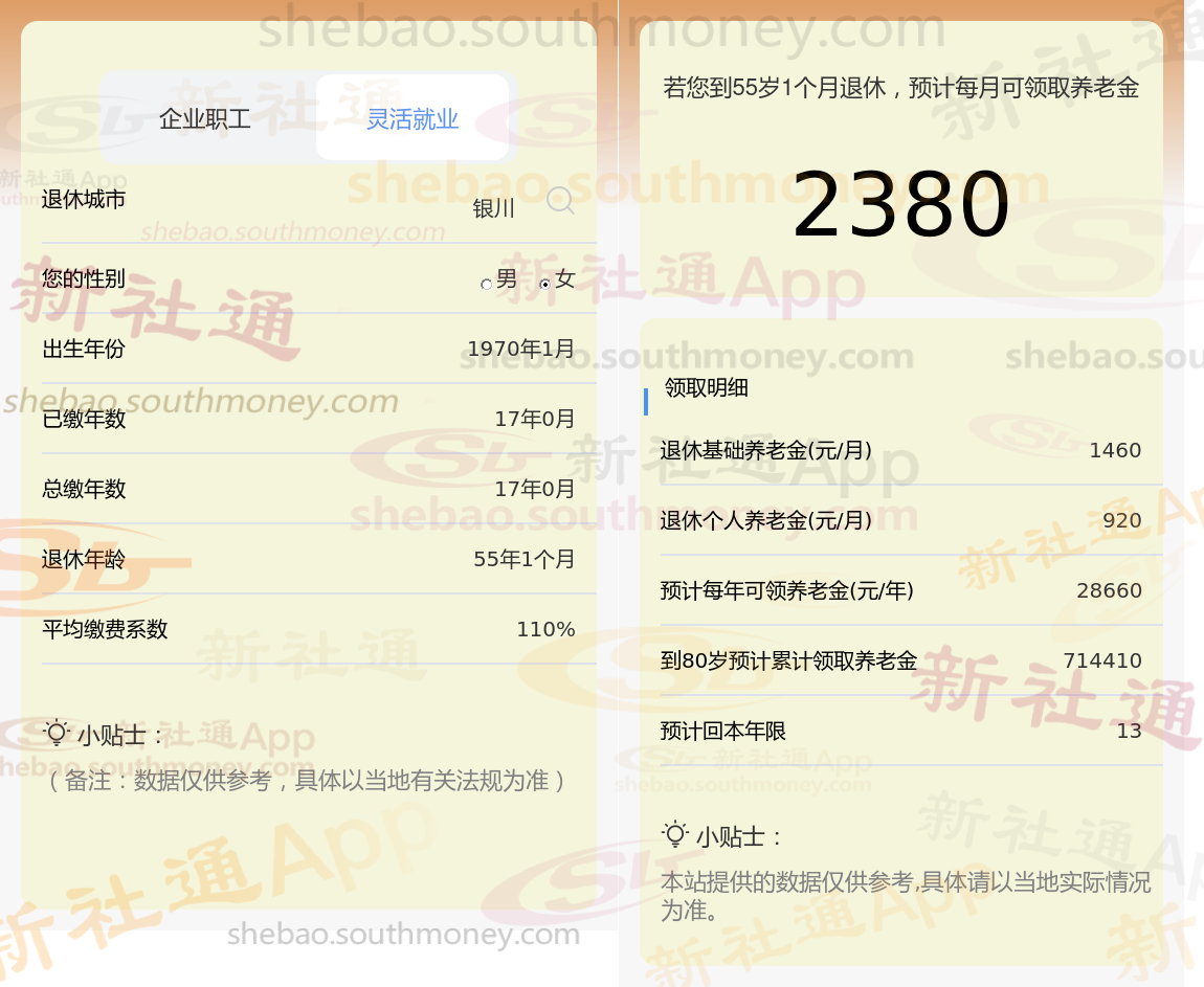 秦某,作为一位勤勉的职工,他的养老保险缴纳记录长达17年之久,且缴费档次一直保持在较高的110%水平。基于这些关键数据,我们利用新社通app养老金计算器,结合最新的养老保险法规,对其养老金进行了如下估算: