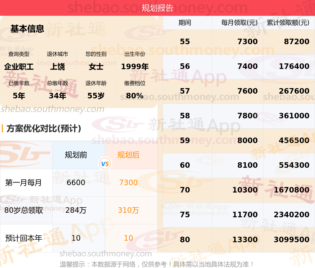 规划前:参保城市:江西上饶,性别:女士,出生年月:1999,已缴年限:5年,总缴年数:34年,退休年龄:55岁,缴费档位:80%。