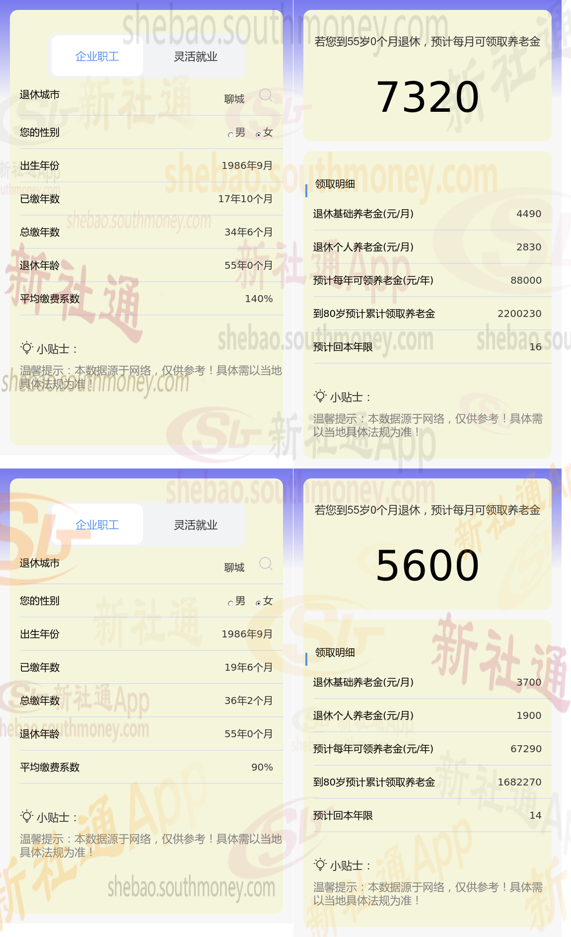 以聊城为具体案例(在此新社-app暂不将过渡养老金纳入考量):谢某在聊城退休,其社保缴费的累计年数为34年,于55周岁时正式步入退休生活,且一直以来,他都按照140%的缴费档位进行社保缴纳。