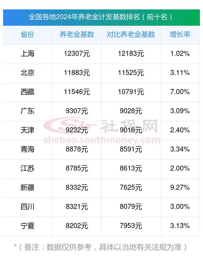 据新社通app显示,2024年上海位列第一位,养老金计发基数达到12307.00元,增长率为1.02%;北京排名第二,养老金计发基数为12183.00元,增长率为6.91%;西藏排名第三,养老金计发基数11883.00元,增长率为3.11%。排名前10的还有:广东(11546.00元,7.00%)、天津(11525.00元,4.00%)、青海(11010.00元,1.99%)、江苏(9307.00元,3.09%)、湖北(9232.00元,2.40%)、新疆(9016.00元,3.97%)、四川(8878.00元,3.34%)。