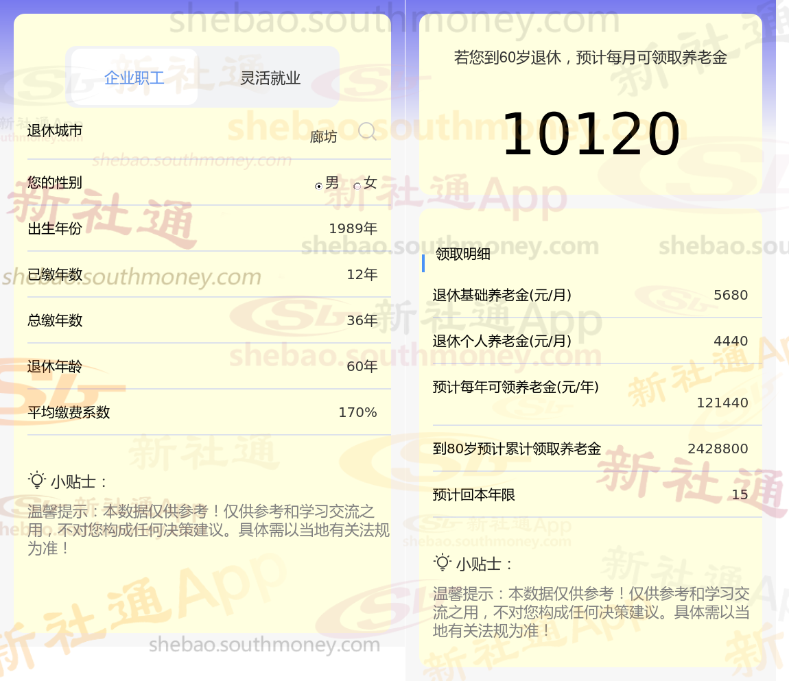 通过新社通APP-养老金计算所得:退休城市、出生年份、退休年龄、缴费系数都相同的情况下,社保缴费年限累计36年时,计算如下: