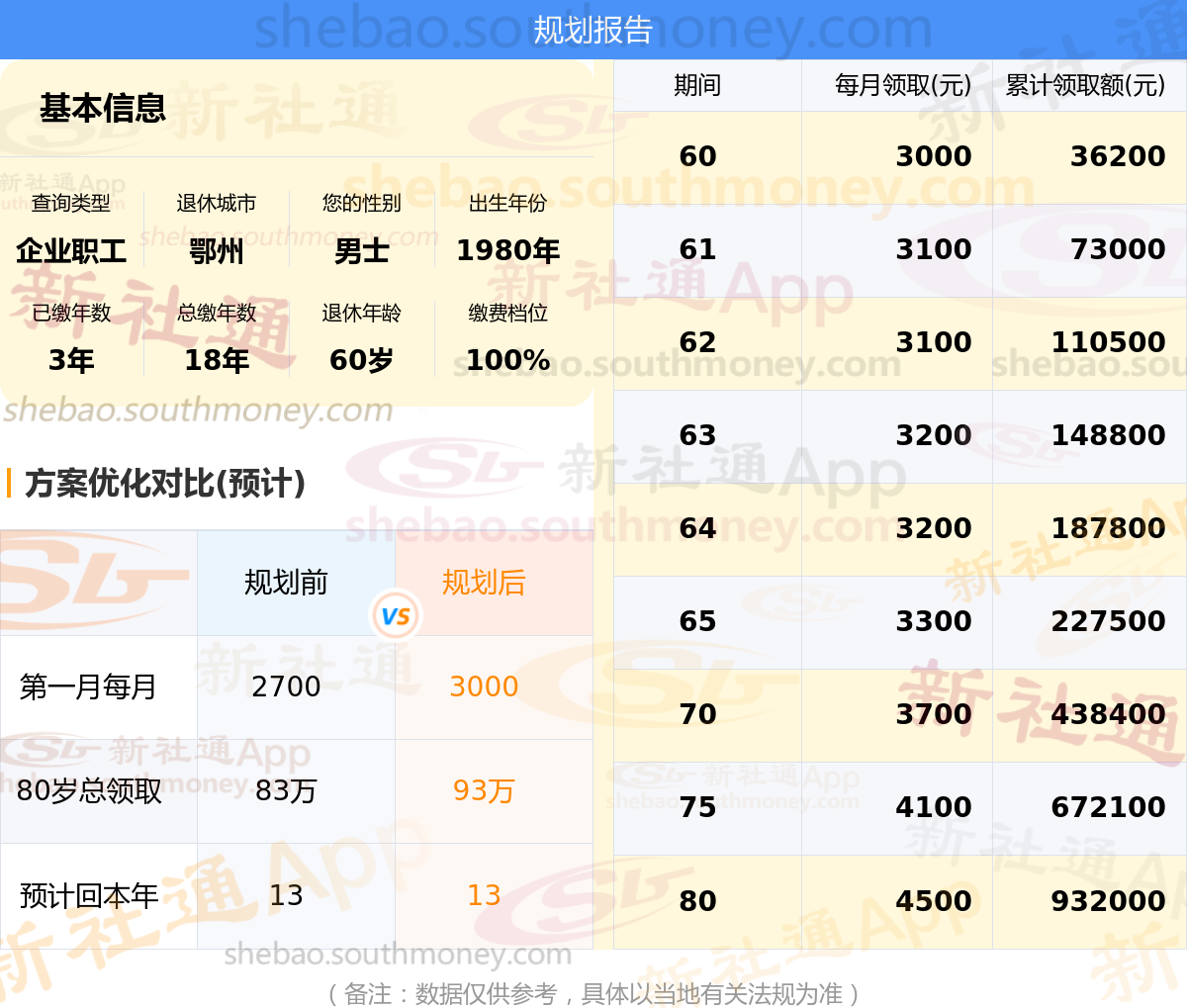 规划后:60岁退休金的计算公式主要包括三个部分:基础养老金、个人账户养老金和过渡性养老金(如有)。根据社保网计算出每月养老金为3000元。