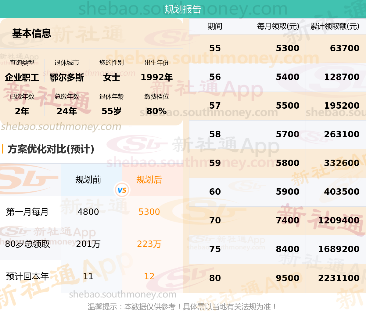 规划前:55岁第一个月约领4800元,新社通APP-养老金规划后:55岁第一个月约领5300元