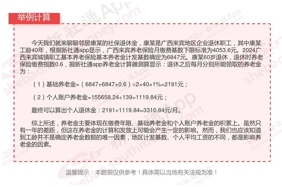 假设,参保人A是广西来宾地区企业退休职工,其中参保人A工龄40年,视同缴费年限8年,视同缴费指数0.6。那么,根据消息显示,广西来宾养老保险月缴费基数下限标准为4053.6元。2024广西来宾城镇职工基本养老保险基本养老金计发基数确定为6847元。参保人60岁退休,退休时养老保险缴费指数0.6,据新社通app养老金计算器测算显示:退休之后每月分别所能领取的养老金为: