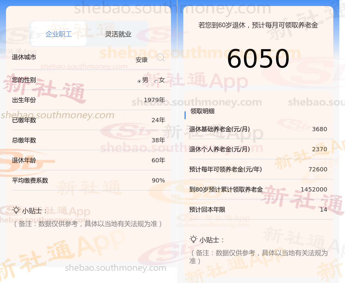 查阅新社通app显示,安康退休员工养老金=基础养老金+个人养老金