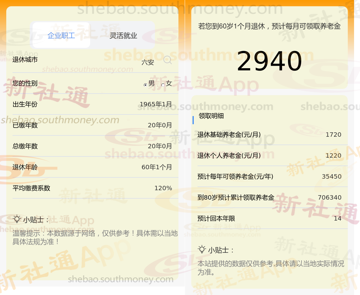 结果显示:他每月可以从个人账户中领取约1220元的养老金。将上述两部分相加,我们得出林某每月预计可以领取的养老金总额为2940元。这一结果是由新社通app养老金计算器基于给定的参数和公式得出的估算值。