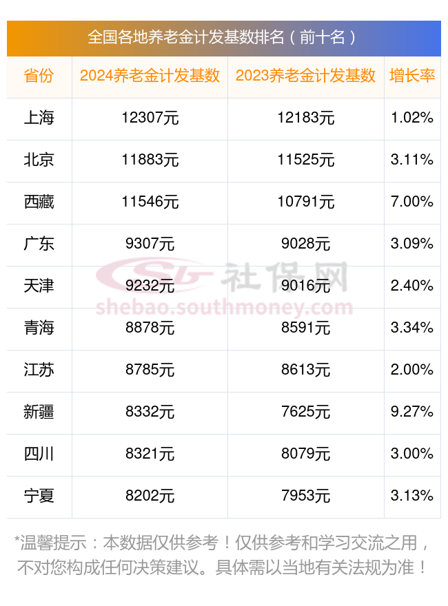 据新社通app显示,2024年上海位列第一位,养老金计发基数达到12307.00元,增长率为1.02%;北京排名第二,养老金计发基数为11883.00元,增长率为3.11%;西藏排名第三,养老金计发基数11546.00元,增长率为7.00%。排名前10的还有:广东(9307.00元,3.09%)、天津(9232.00元,2.40%)、青海(8878.00元,3.34%)、江苏(8785.00元,2.00%)、湖北(8613.00元,0.96%)、新疆(8332.00元,9.27%)、四川(8321.00元,3.00%)。