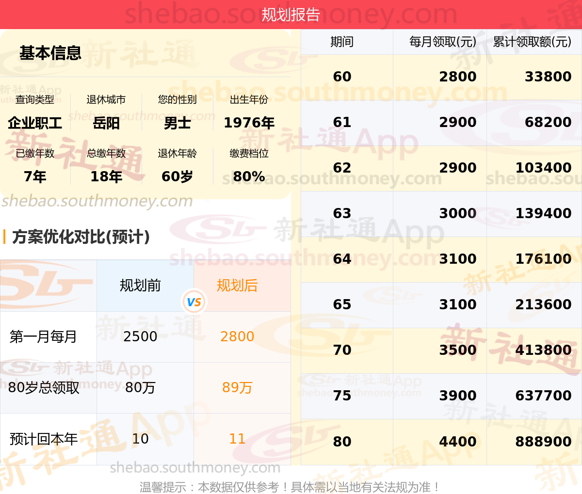规划前:参保城市:湖南岳阳,性别:男士,出生年月:1976,已缴年限:7年,总缴年数:18年,退休年龄:60岁,缴费档位:80%。