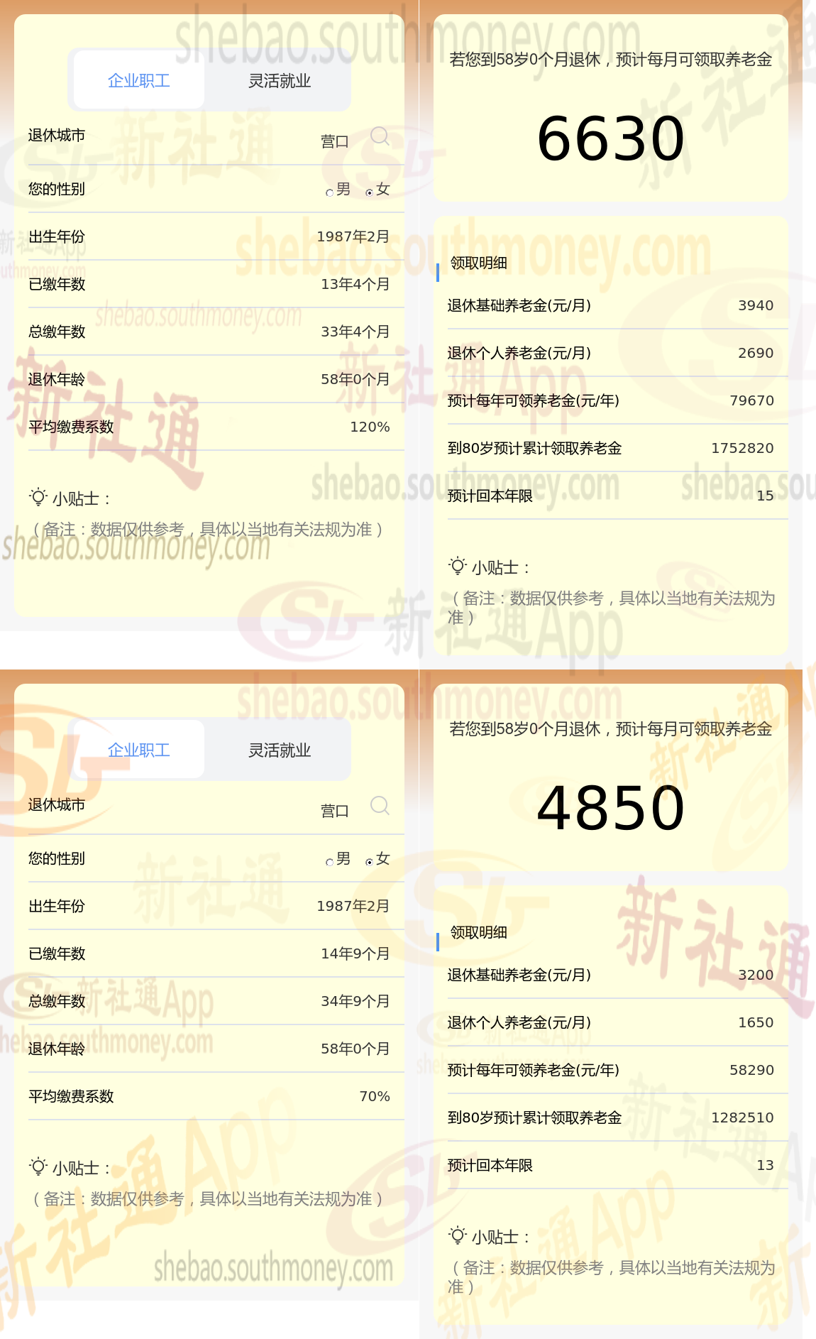 老李:退休城市营口,缴费年限34年,退休年龄58周岁,但是按70%缴纳社保。