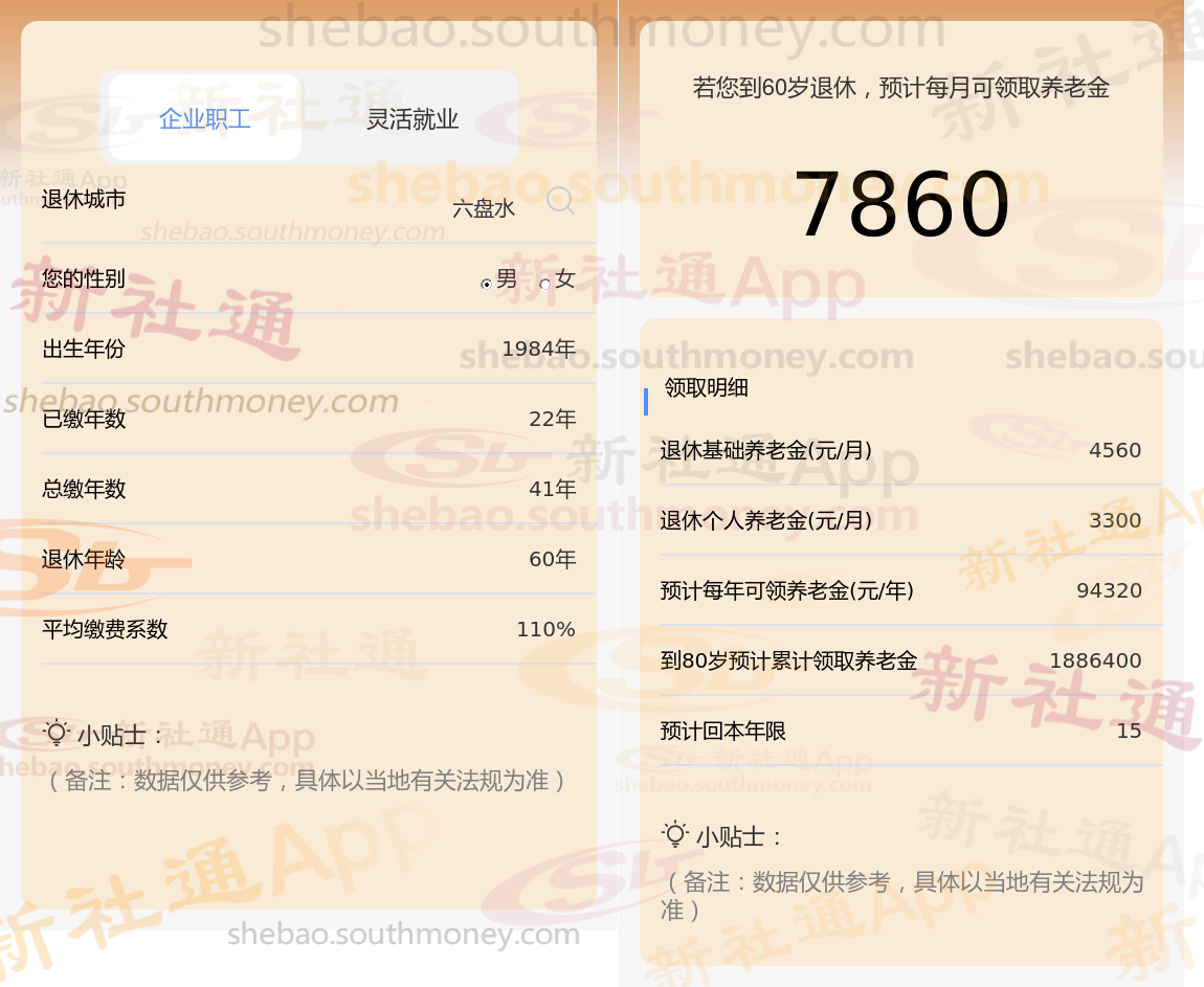 通过新社通APP-养老金计算所得:退休城市、出生年份、退休年龄、缴费系数都相同的情况下,社保缴费年限累计41年时,计算如下: