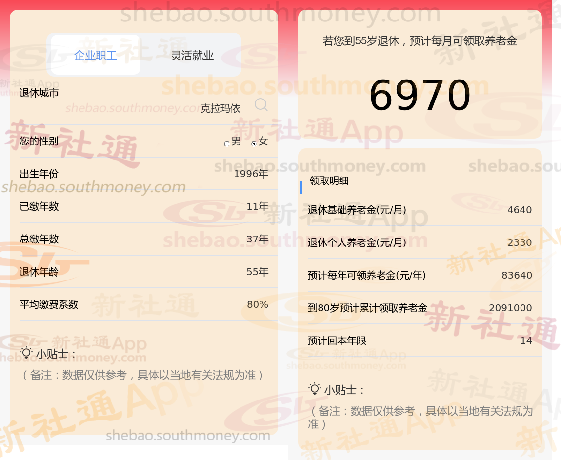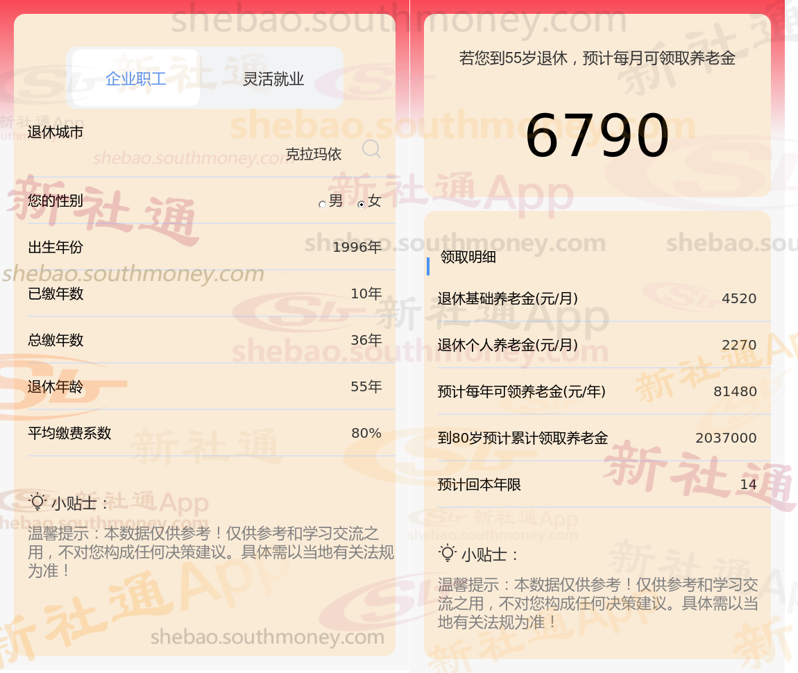 通过新社通APP-养老金计算所得:退休城市、出生年份、退休年龄、缴费系数都相同的情况下,社保缴费年限累计37年时,计算如下: