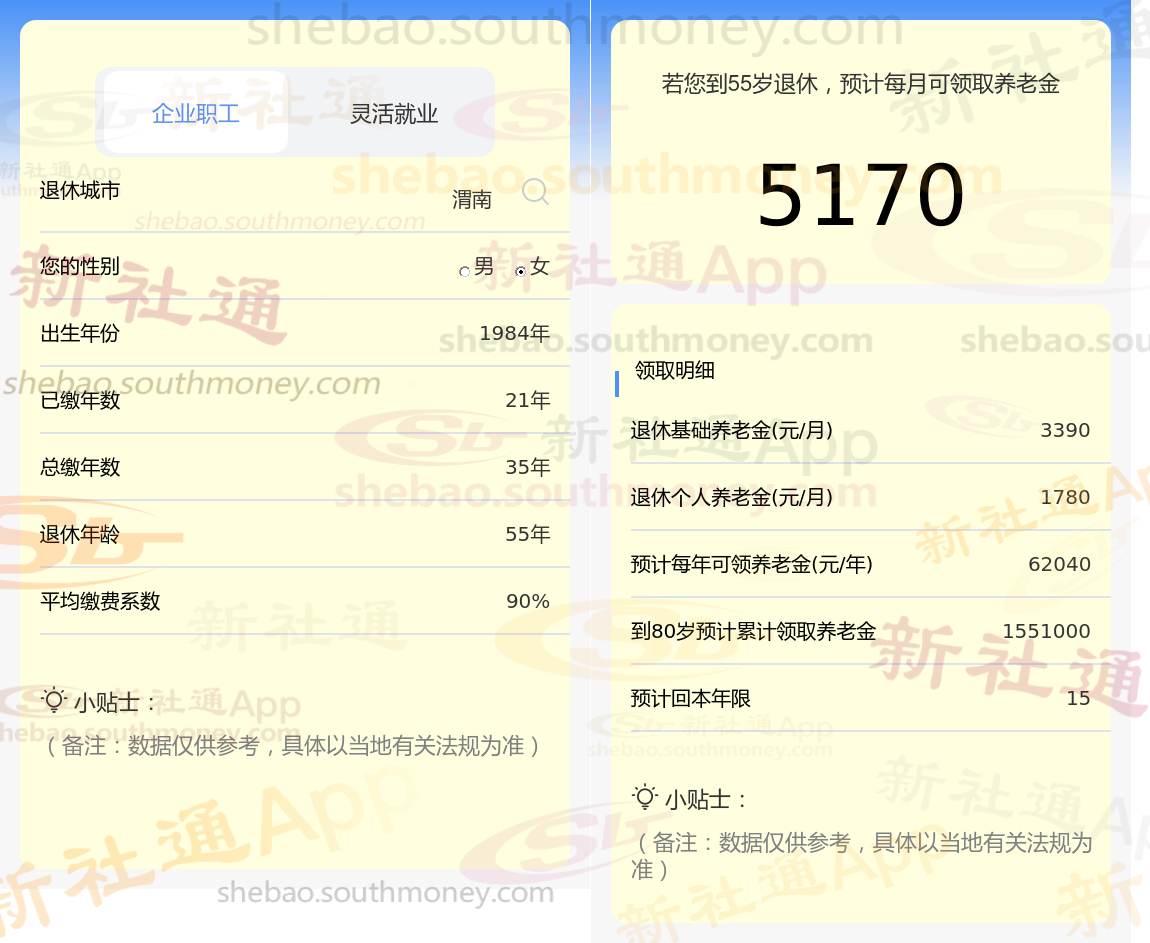 通过新社通APP-养老金计算所得:退休城市、出生年份、退休年龄、缴费系数都相同的情况下,社保缴费年限累计35年时,计算如下:
