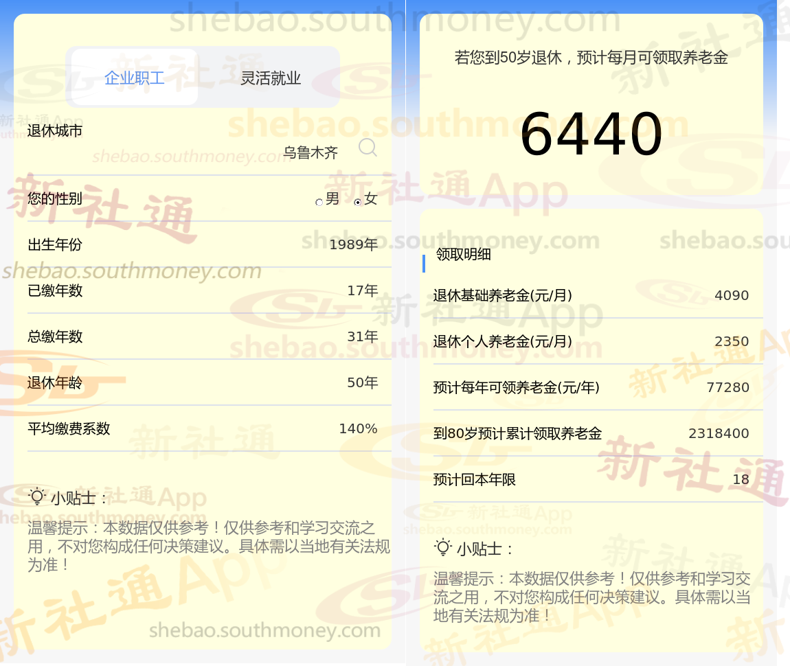 通过新社通APP-养老金计算所得:退休城市、出生年份、退休年龄、缴费系数都相同的情况下,社保缴费年限累计31年时,计算如下: