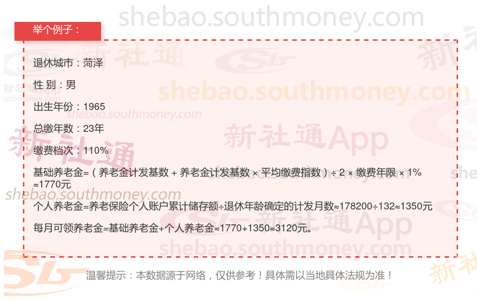 退休城市:菏泽,性别:男,出生年份:1965,总缴年数23年,缴费档次:110%