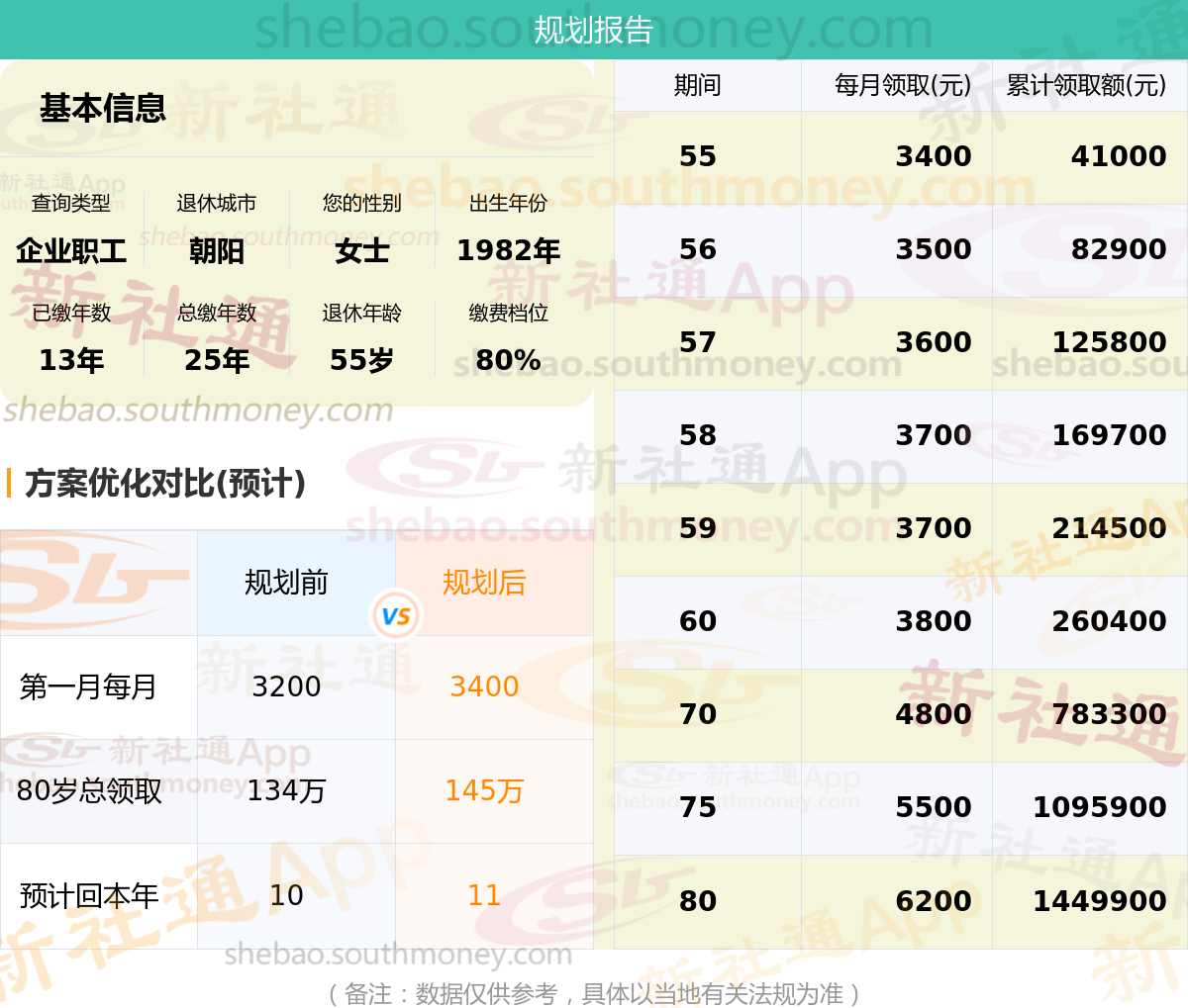 规划前:55岁第一个月约领3200元,新社通APP-养老金规划后:55岁第一个月约领3400元