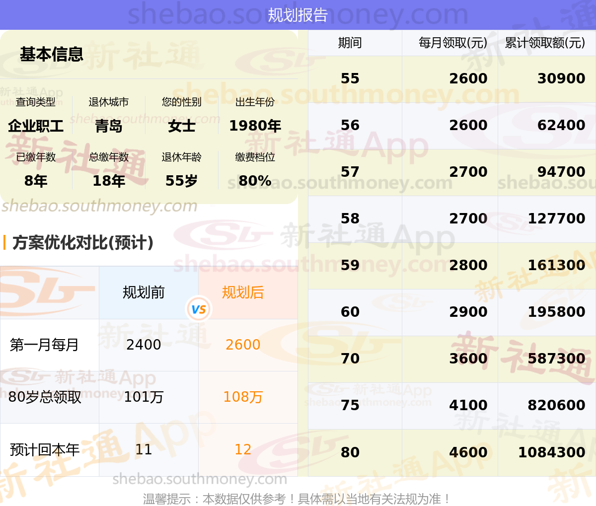 规划前:参保城市:山东青岛,性别:女士,出生年月:1980,已缴年限:8年,总缴年数:18年,退休年龄:55岁,缴费档位:80%。