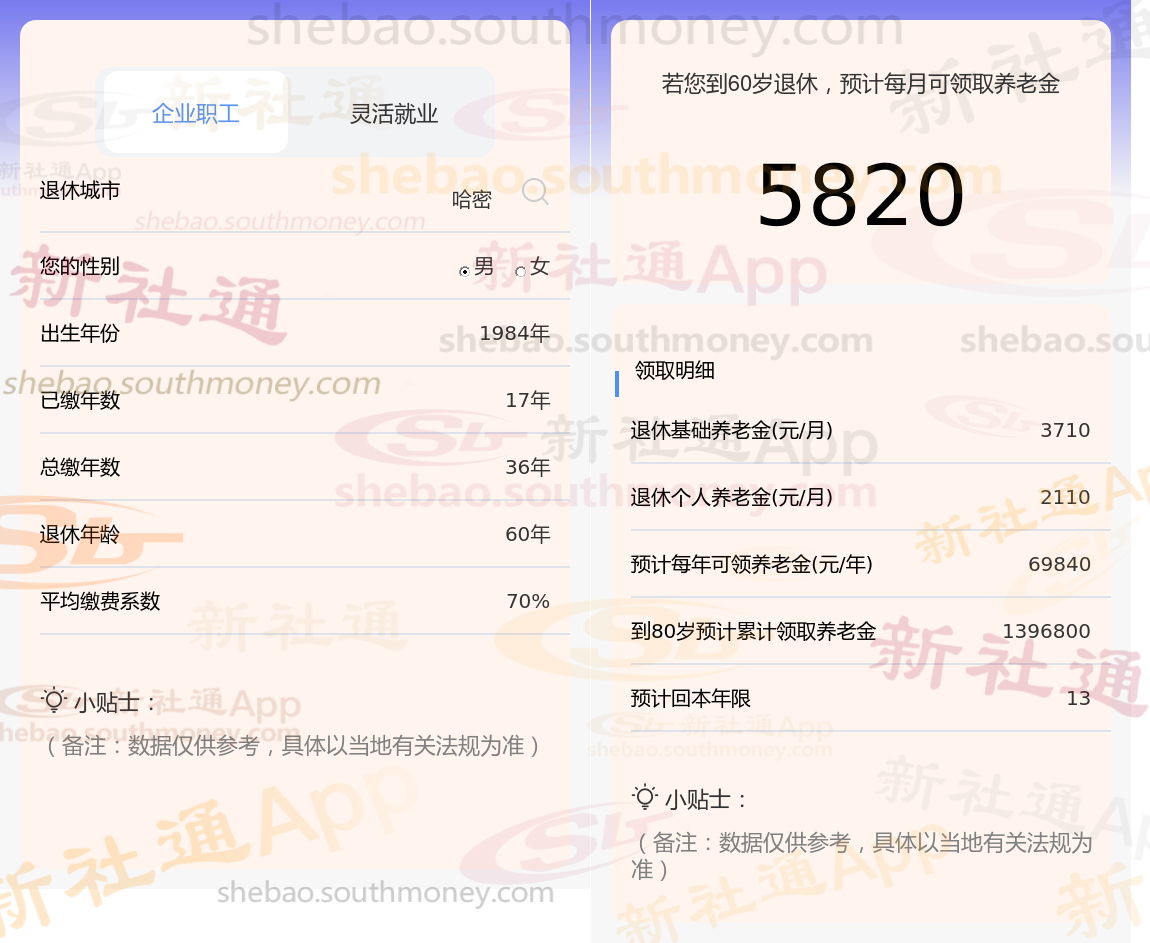 通过新社通APP-养老金计算所得:退休城市、出生年份、退休年龄、缴费系数都相同的情况下,社保缴费年限累计36年时,计算如下: