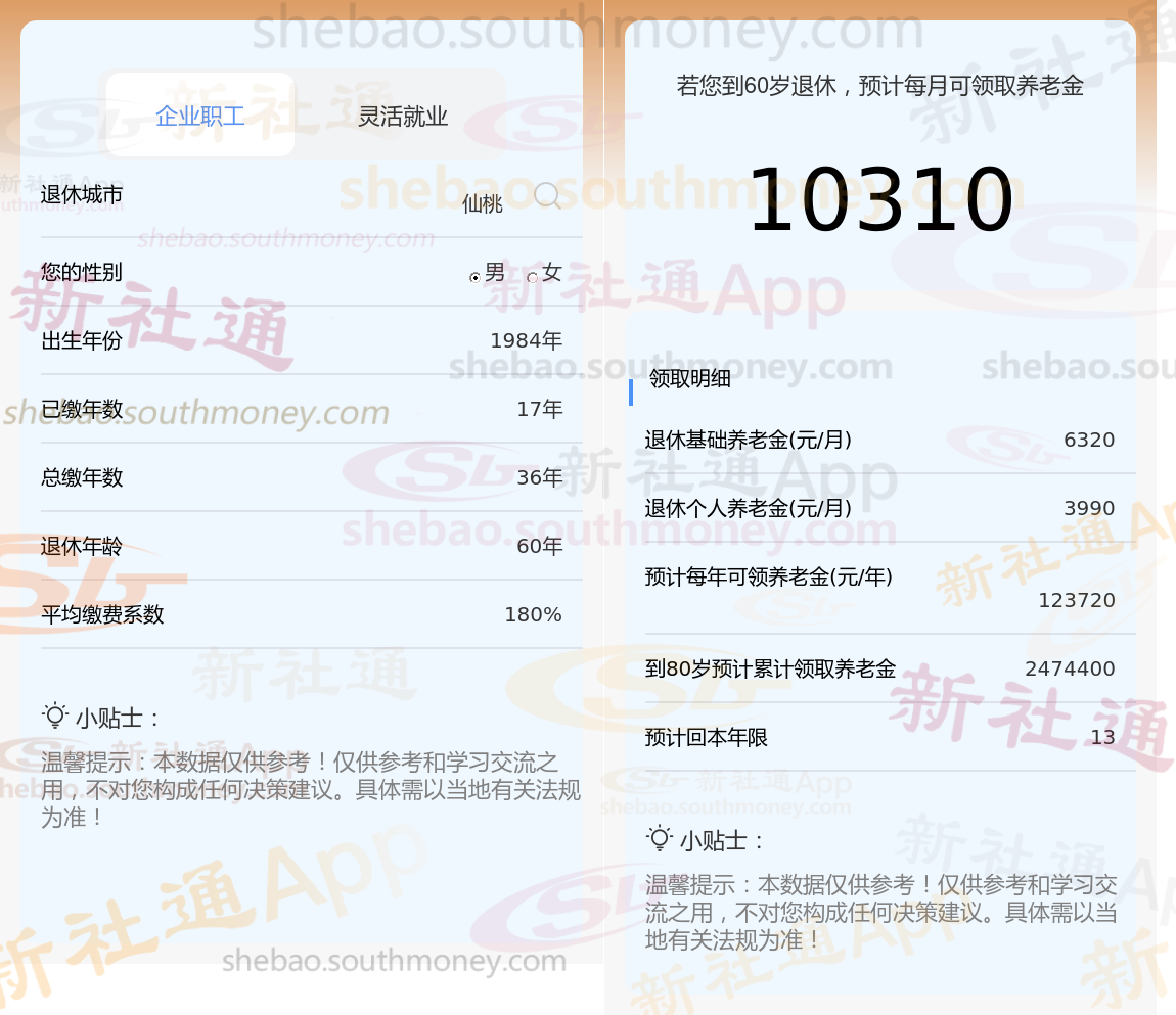 通过新社通APP-养老金计算所得:退休城市、出生年份、退休年龄、缴费系数都相同的情况下,社保缴费年限累计36年时,计算如下: