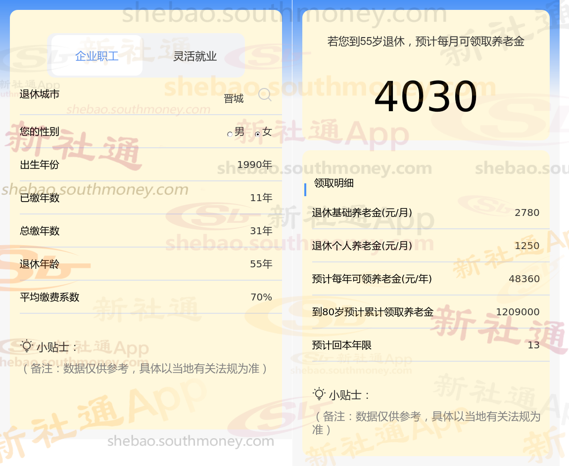 通过新社通APP-养老金计算所得:退休城市、出生年份、退休年龄、缴费系数都相同的情况下,社保缴费年限累计31年时,计算如下: