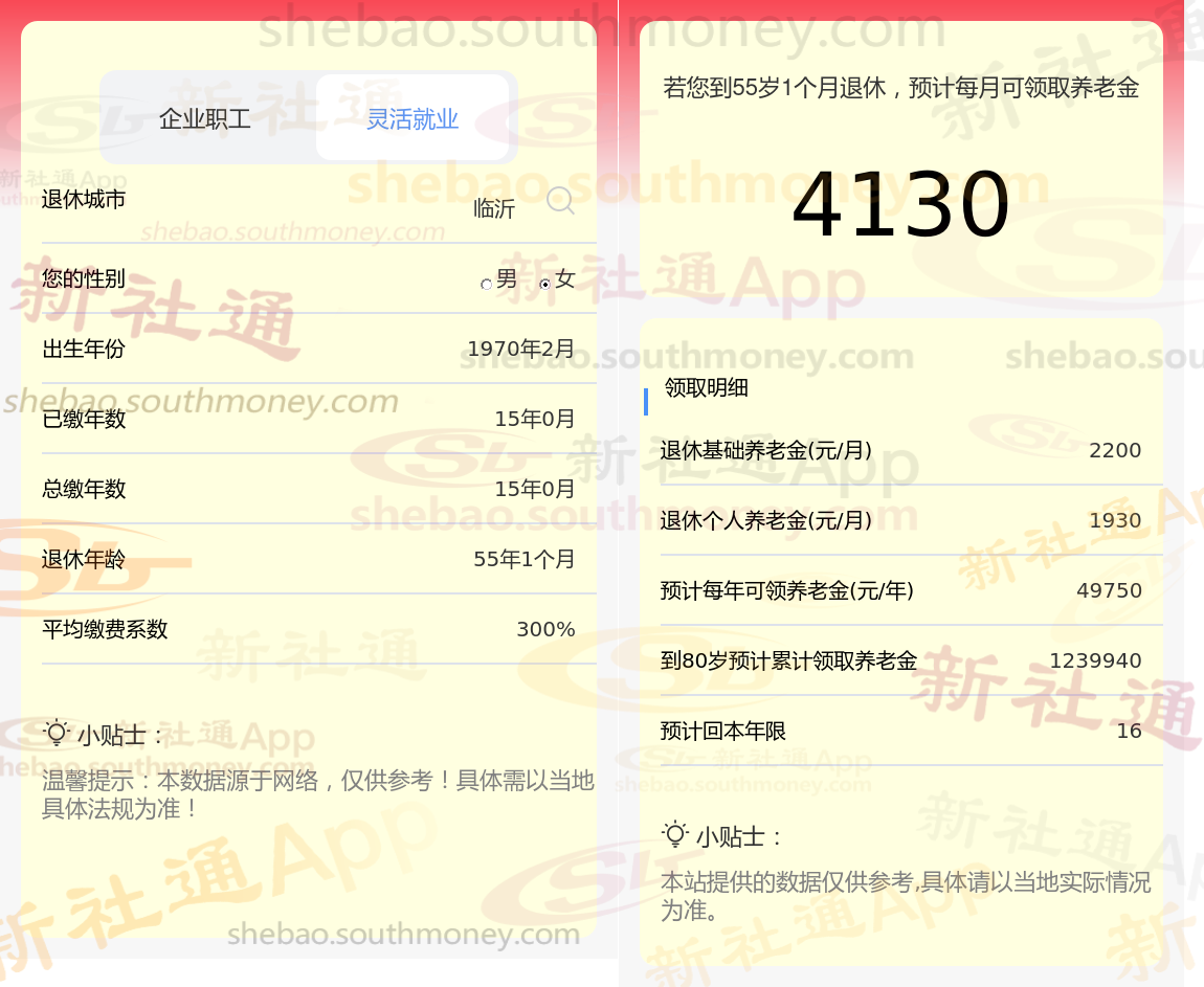 通过上面公式和新社-app根据新社通app-社保缴费查询工具提供的最新数据一起来了解下,临沂退休养老金怎么算?