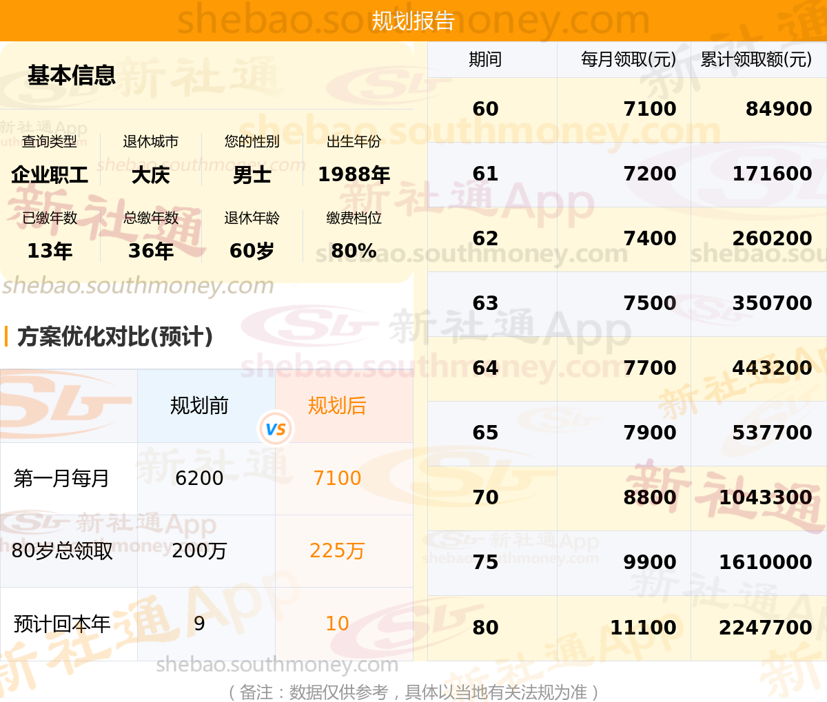 规划前:60岁第一个月约领6200元,新社通APP-养老金规划后:60岁第一个月约领7100元