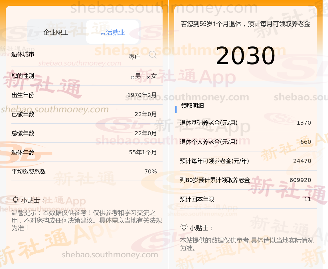 退休城市:枣庄,性别:女,出生年份:1970,总缴年数22年,缴费档次:70%,新社通app养老金计算器所得: