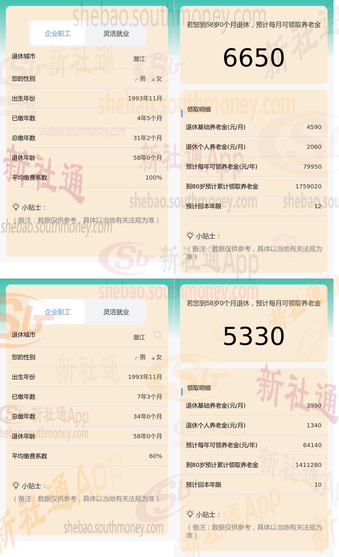 根据新社通app养老金计算器,轻松测算您的养老金!计算所得出:吕某与老王的差别,缴费年限、缴费档位不同的情况下,差别6650-5330=1320元。