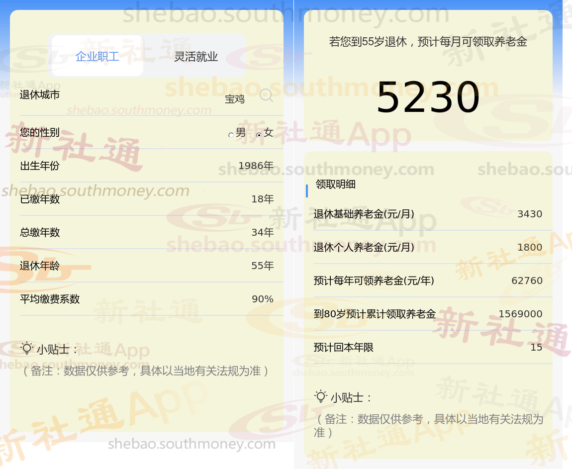 通过新社通APP-养老金计算所得:退休城市、出生年份、退休年龄、缴费系数都相同的情况下,社保缴费年限累计34年时,计算如下: