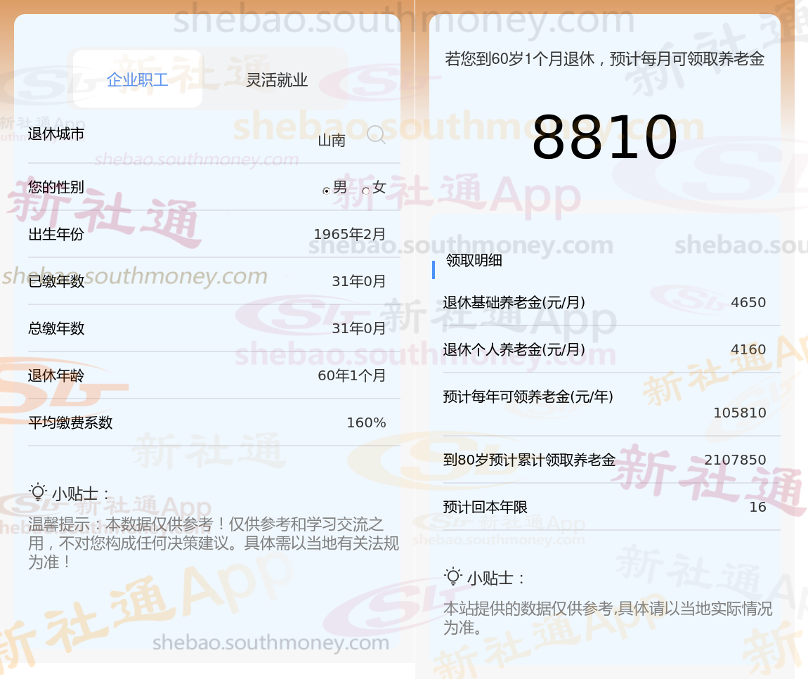 基于这些关键信息,我们使用新社通app养老金计算器对他未来的养老金进行了详细估算: