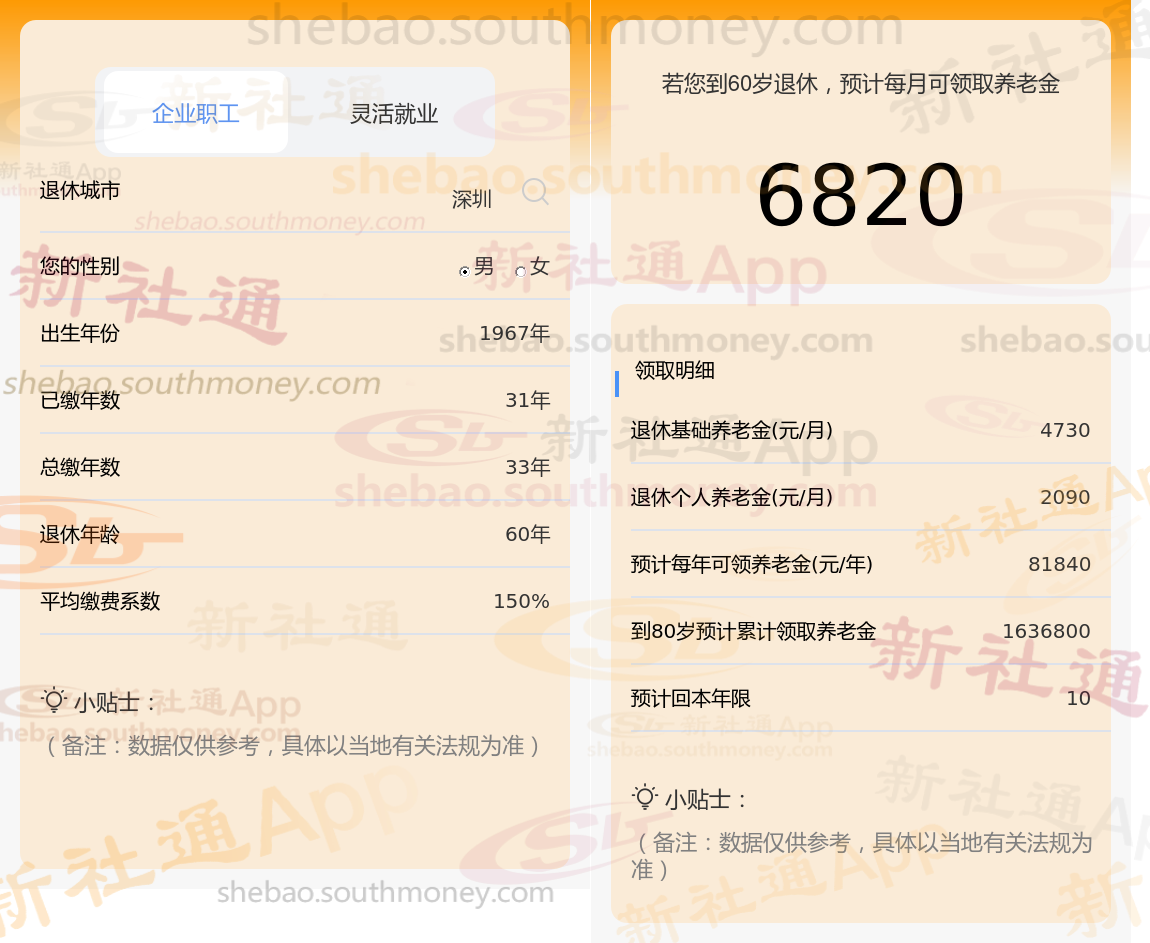 通过新社通APP-养老金计算所得:退休城市、出生年份、退休年龄、缴费系数都相同的情况下,社保缴费年限累计33年时,计算如下: