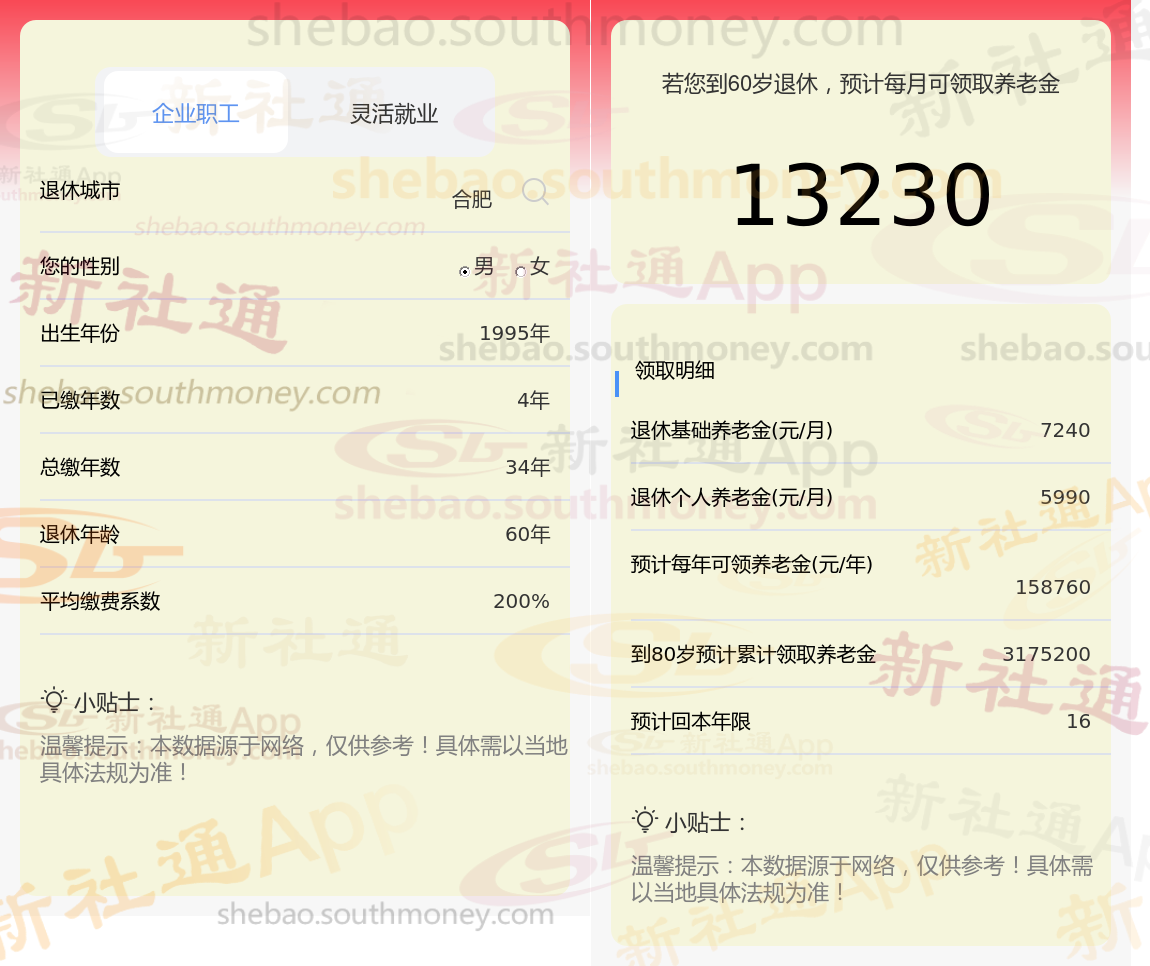 通过新社通APP-养老金计算所得:退休城市、出生年份、退休年龄、缴费系数都相同的情况下,社保缴费年限累计34年时,计算如下: