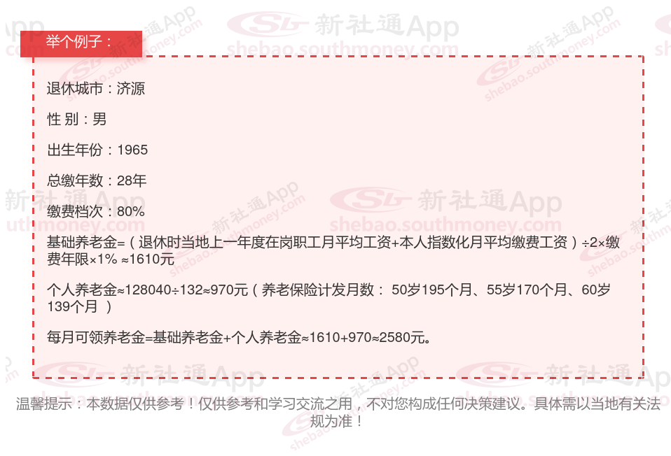 至于个人养老金,它是基于个人养老金账户余额128040元来计算的,并且与退休年龄相关,这里我们假设退休年龄对应的计发月数为132个月。因此,个人养老金的估算值为128040元除以132个月,结果大约是970元。