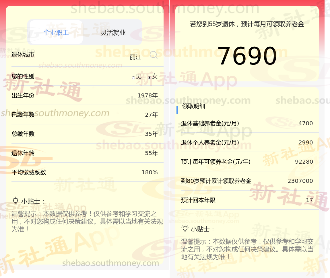 通过新社通APP-养老金计算所得:退休城市、出生年份、退休年龄、缴费系数都相同的情况下,社保缴费年限累计35年时,计算如下: