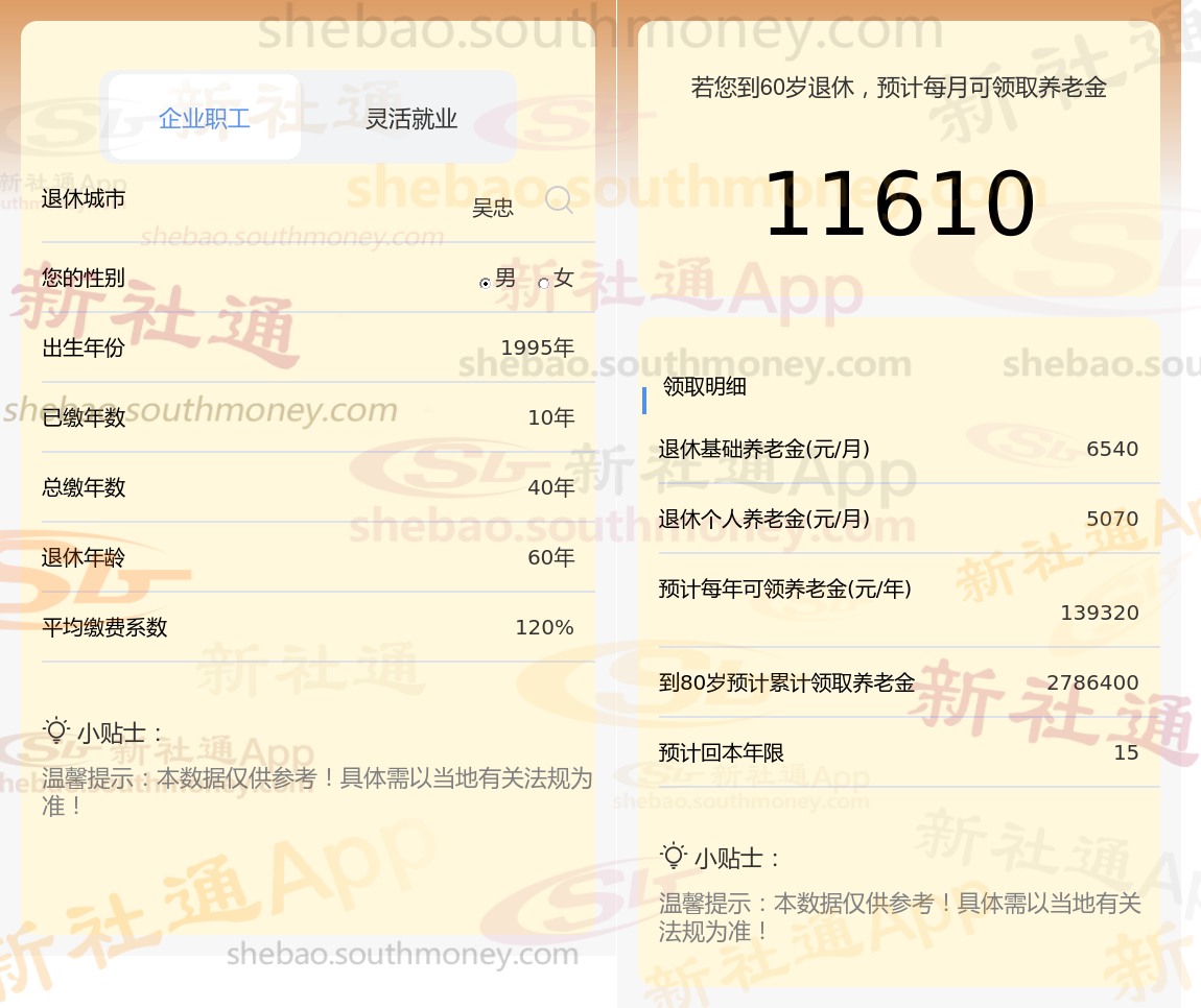 通过新社通APP-养老金计算所得:退休城市、出生年份、退休年龄、缴费系数都相同的情况下,社保缴费年限累计40年时,计算如下: