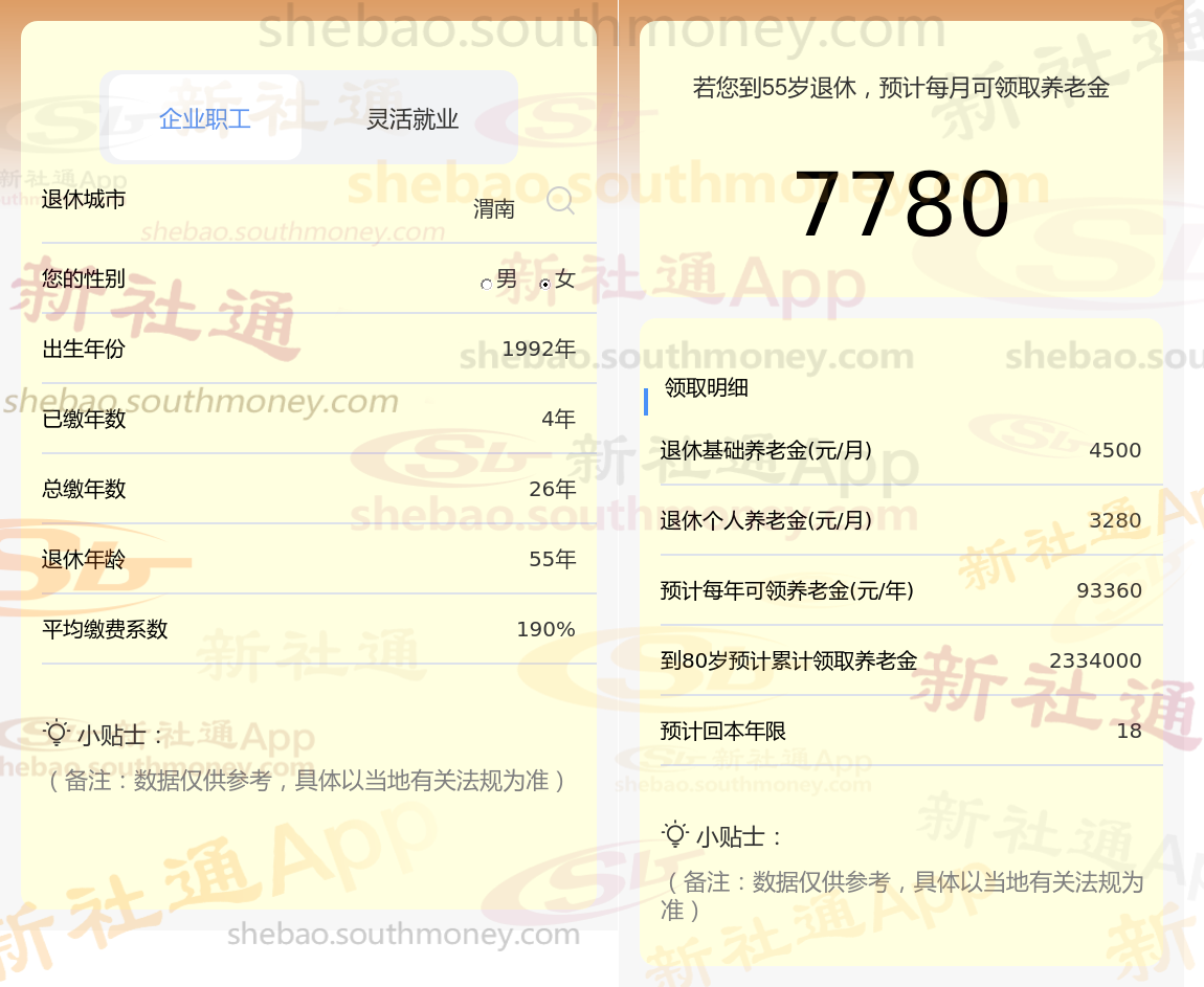 通过新社通APP-养老金计算所得:退休城市、出生年份、退休年龄、缴费系数都相同的情况下,社保缴费年限累计26年时,计算如下:
