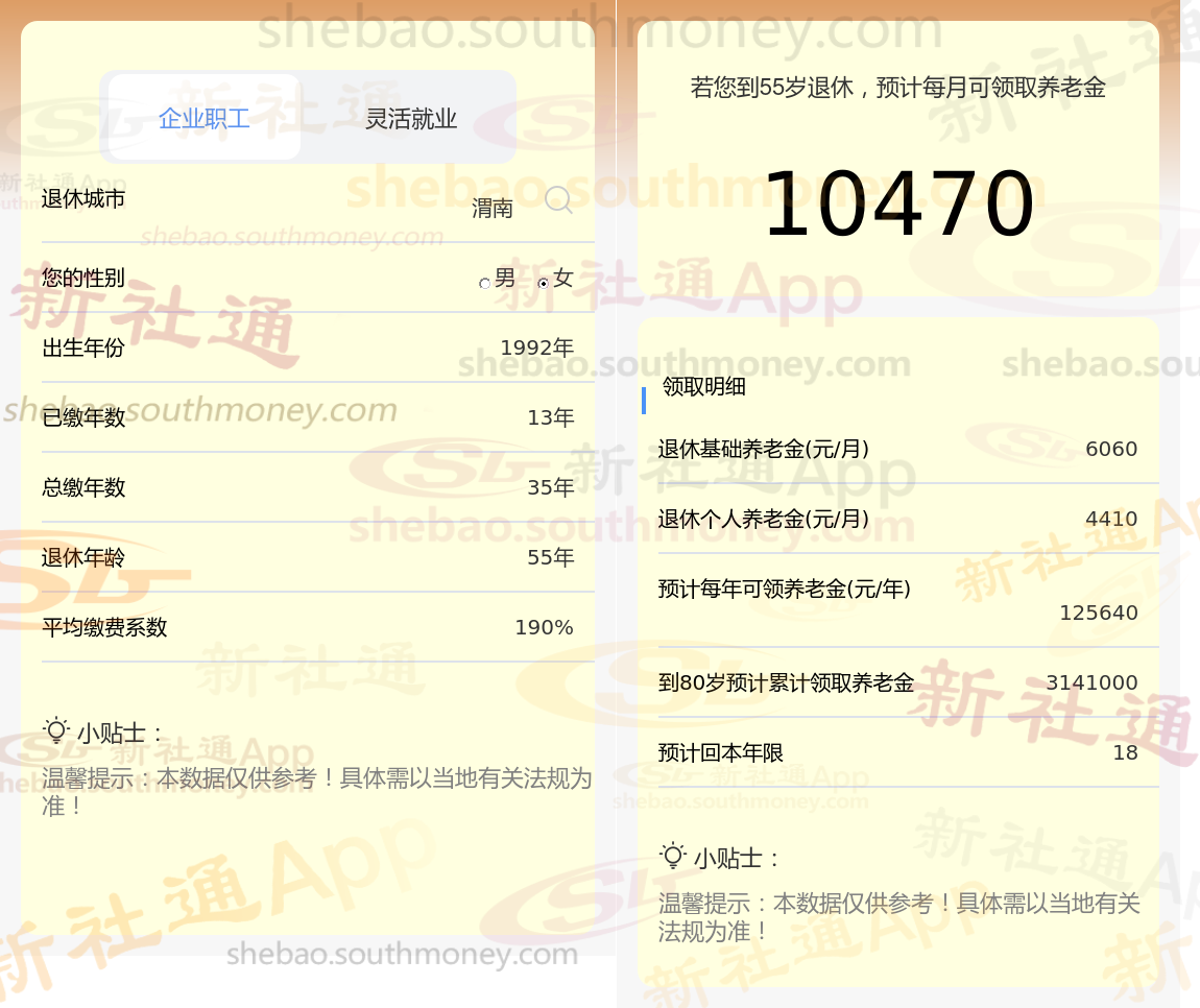 通过新社通APP-养老金计算所得:退休城市、出生年份、退休年龄、缴费系数都相同的情况下,社保缴费年限累计35年时,计算如下:
