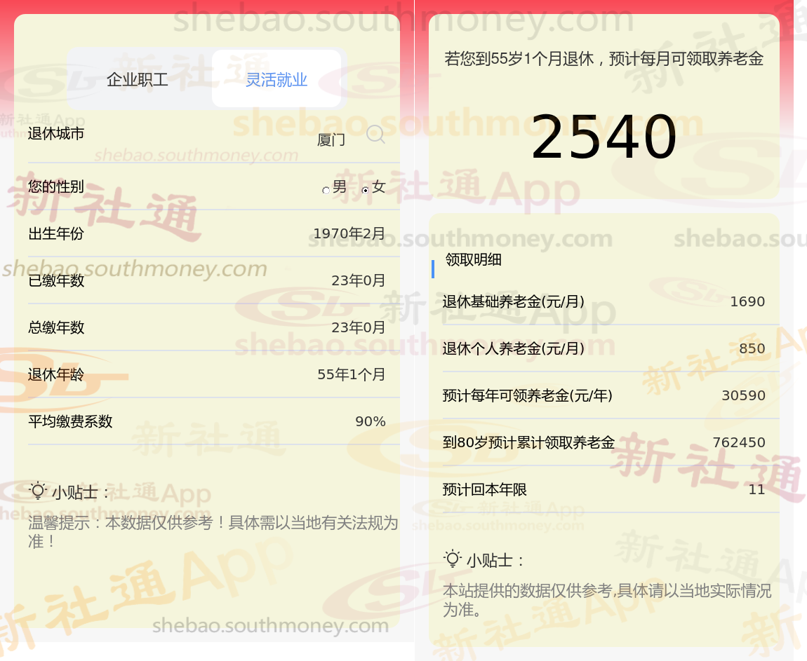 退休城市:厦门,性别:女,出生年份:1970,总缴年数23年,缴费档次:90%,新社通app养老金计算器所得: