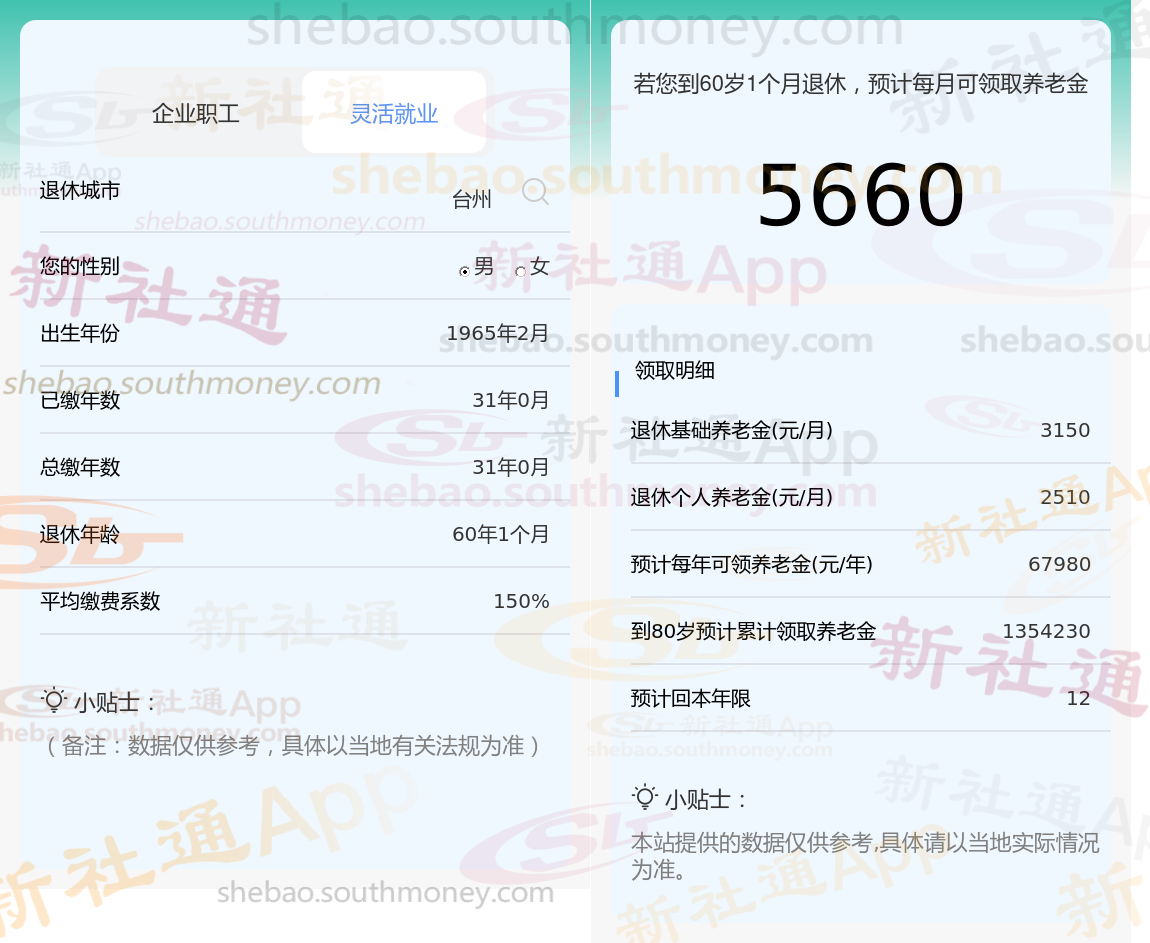 基于这些关键信息,我们使用新社通app养老金计算器对他未来的养老金进行了详细估算: