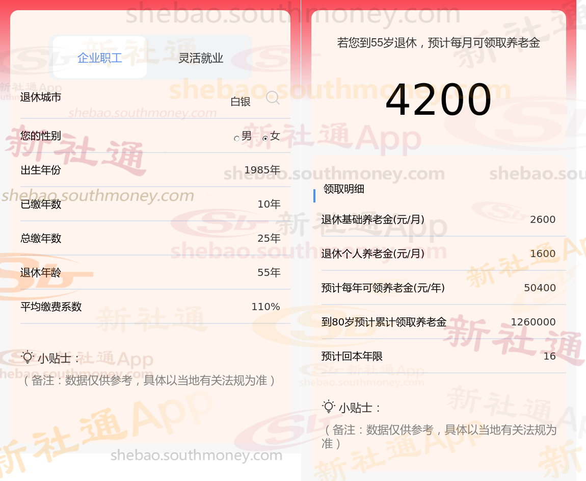 通过新社通APP-养老金计算所得:退休城市、出生年份、退休年龄、缴费系数都相同的情况下,社保缴费年限累计21年时,计算如下: