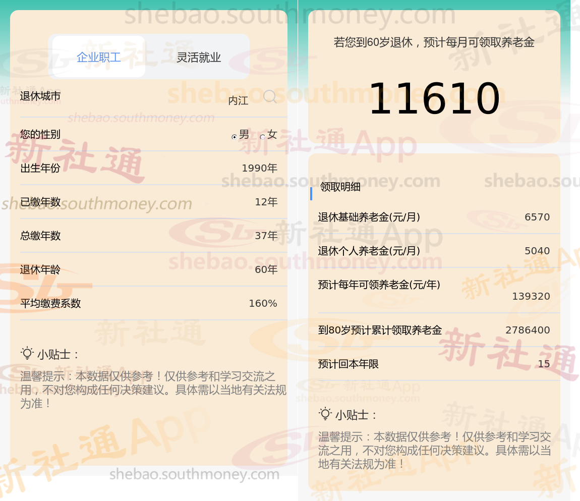 通过新社通APP-养老金计算所得:退休城市、出生年份、退休年龄、缴费系数都相同的情况下,社保缴费年限累计37年时,计算如下: