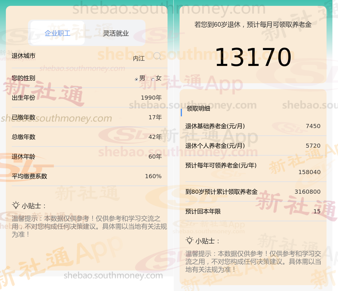 通过新社通APP-养老金计算所得:退休城市、出生年份、退休年龄、缴费系数都相同的情况下,社保缴费年限累计42年时,计算如下: