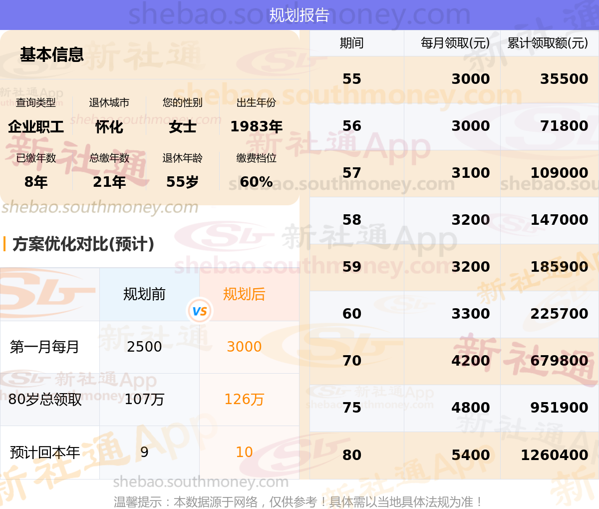 规划前:55岁退休后约领2500元,新社通APP-养老金规划后:55岁退休后约领3000元
