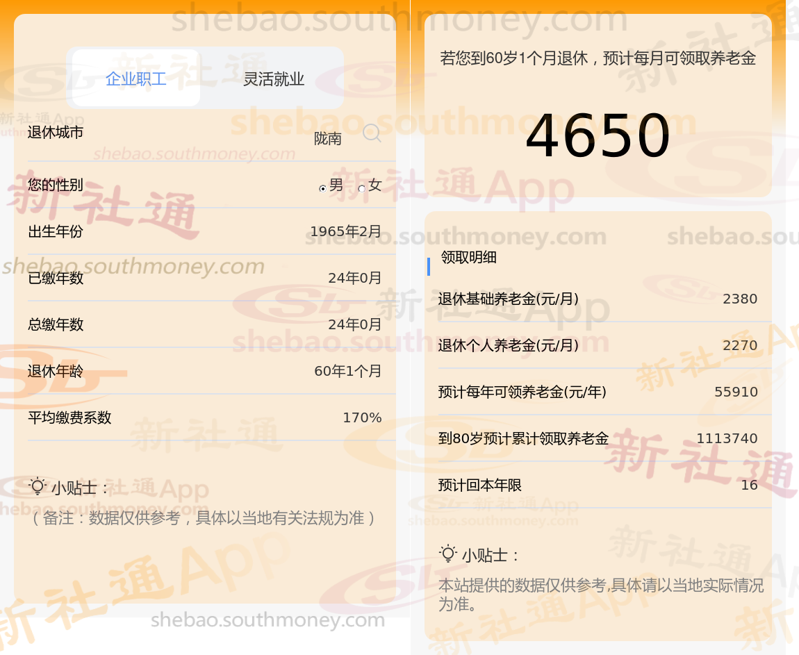 退休城市:陇南,性别:男,出生年份:1965,总缴年数24年,缴费档次:170%,新社通app养老金计算器所得: