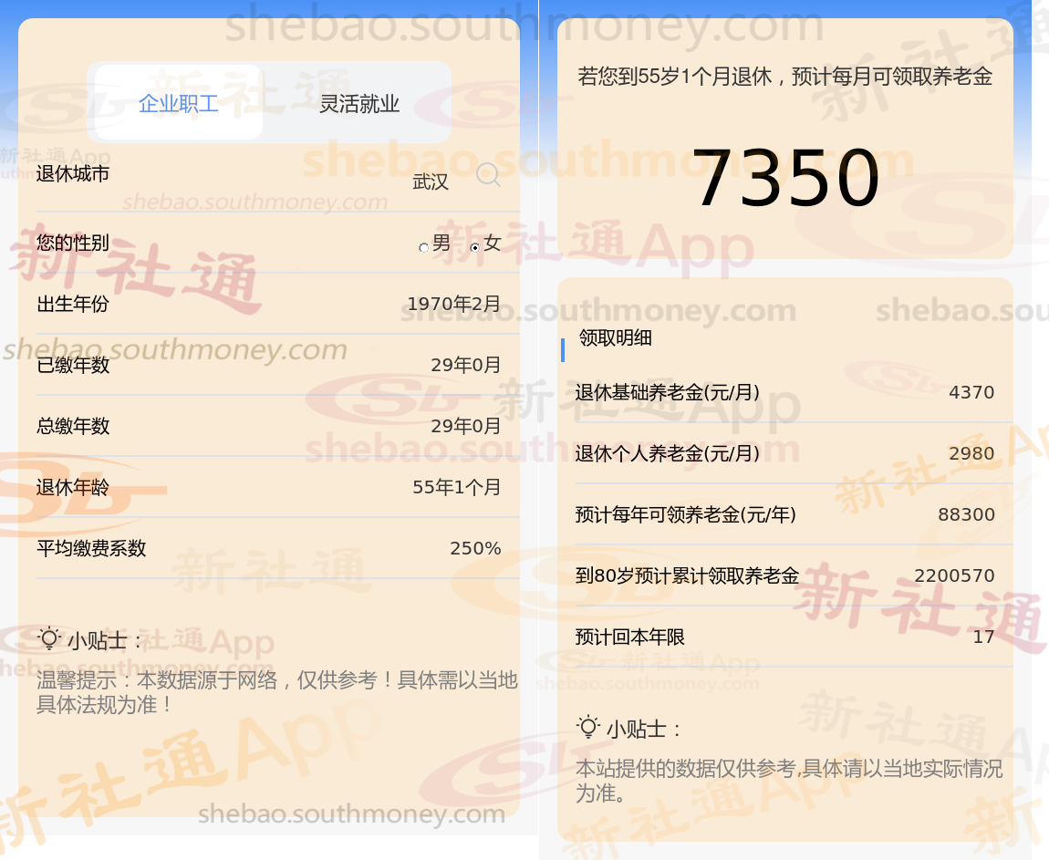 邻居朱某退休城市在武汉,性别:女,出生年份:1970,总缴年数29年,缴费档次:250%