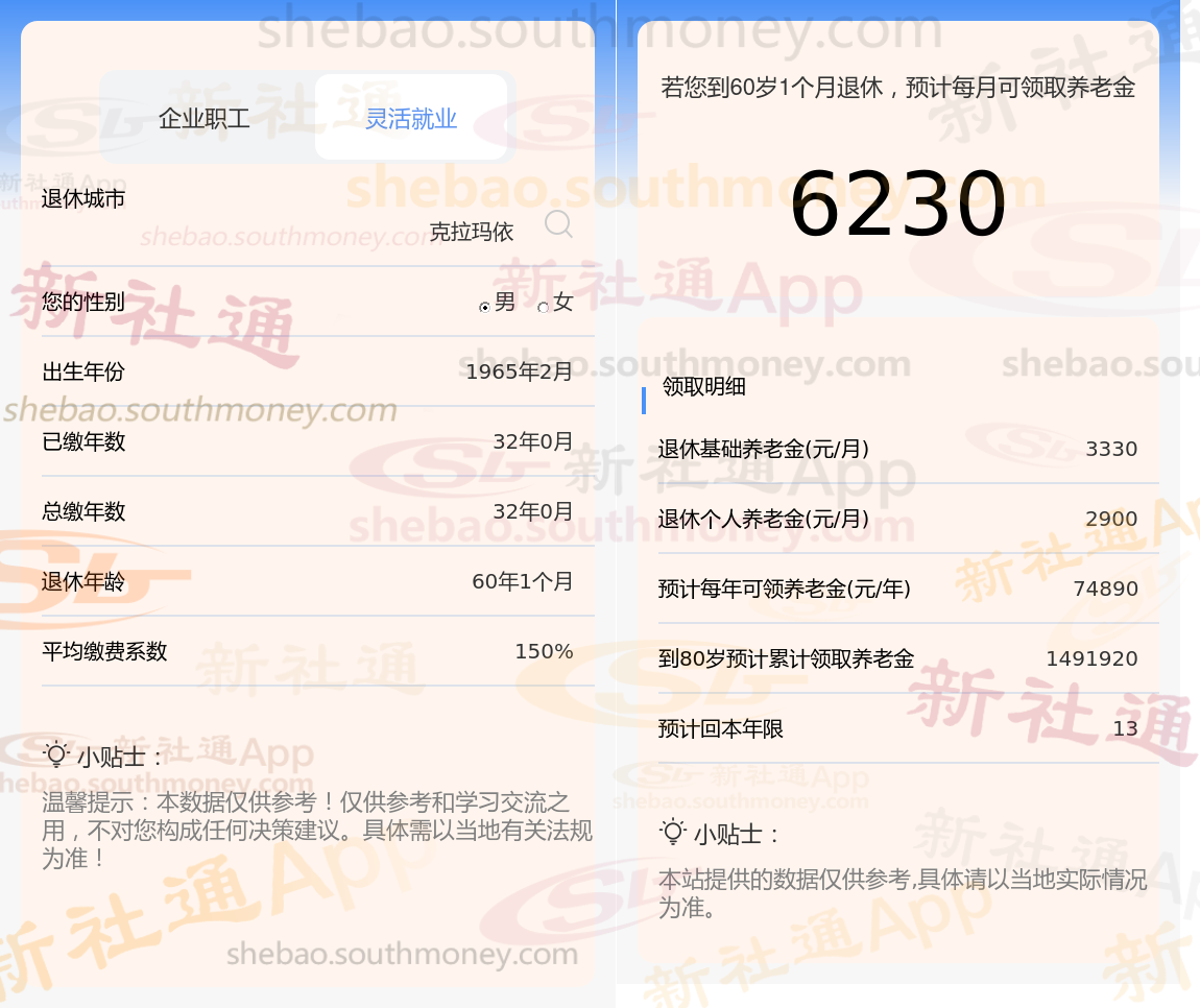 退休城市:克拉玛依,性别:男,出生年份:1965,总缴年数32年,缴费档次:150%,新社通app养老金计算器所得: