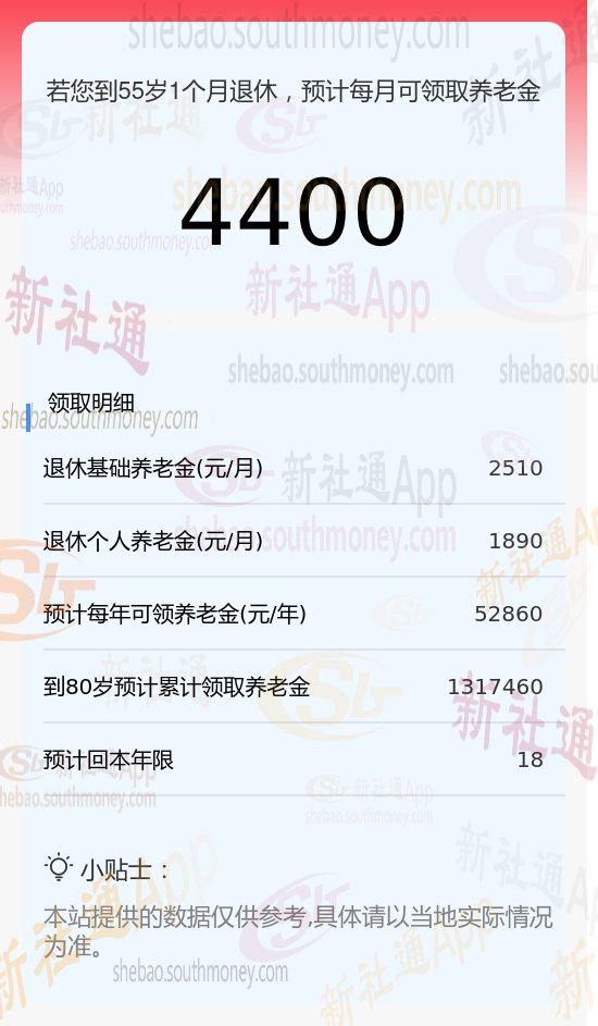 新社通app养老金计算器计算所得: