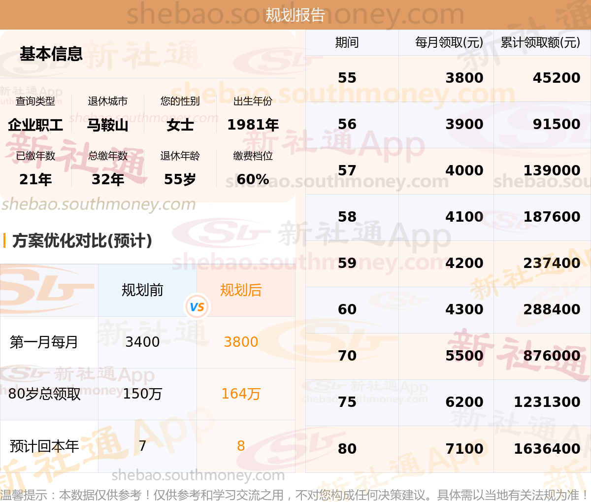 规划前:参保城市:安徽马鞍山,性别:女士,出生年月:1981,已缴年限:21年,总缴年数:32年,退休年龄:55岁,缴费档位:60%。