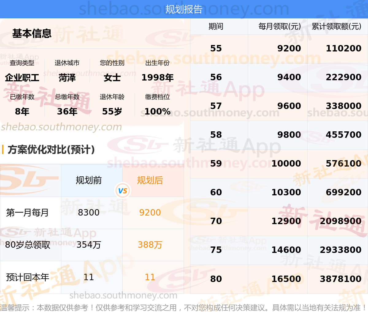 规划前:55岁第一个月养老工资约8300元,新社通APP-养老金规划后:55岁第一个月养老工资约9200元