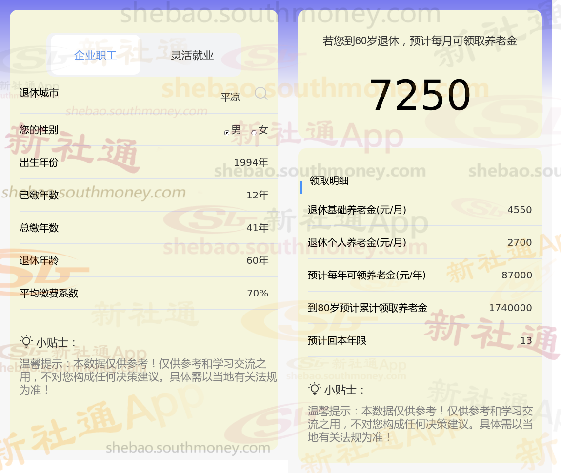 通过新社通APP-养老金计算所得:退休城市、出生年份、退休年龄、缴费系数都相同的情况下,社保缴费年限累计41年时,计算如下: